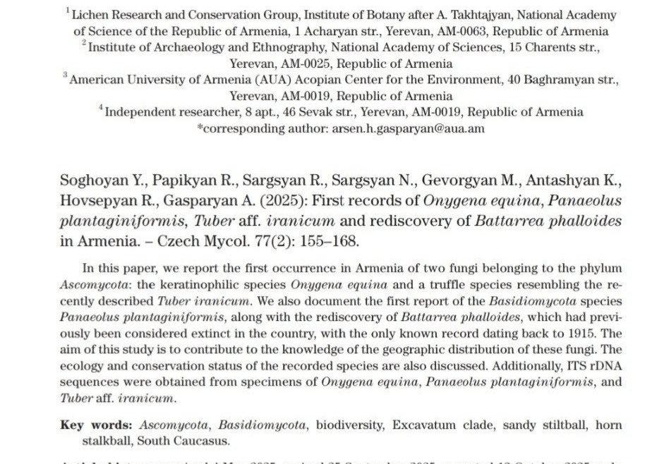 Քարաքոսերի հետազոտման և պահպանության գիտական խմբի նոր հոդվածը՝ Czech Mycology միջազգային գիտական ամսագրում․